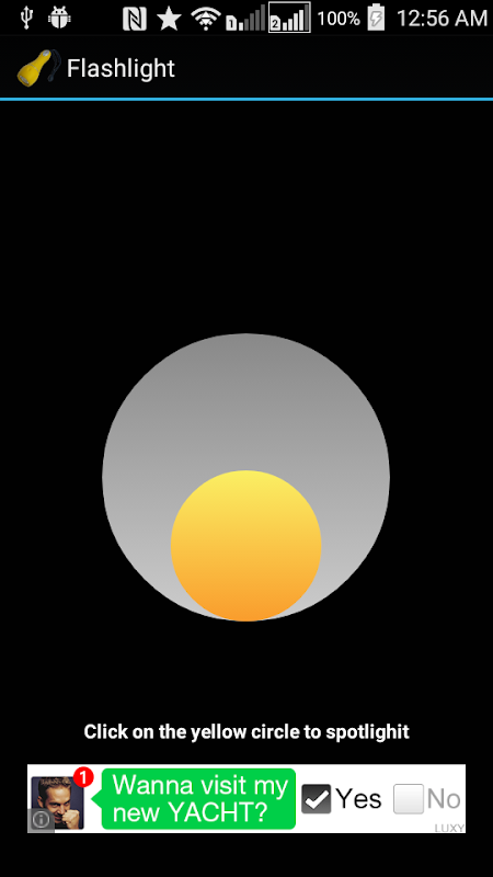 O aplicativo Flashlight é oferecido gratuitamente, ele serve para acender o flash da câmera do seu aparelho para ser usado como uma lanterna elétrica, tem apenas esse botão no meio que representa o botão de uma lanterna comum, basta voce clicar no botão amarelo para acender e usar o seu celular como uma lanterna