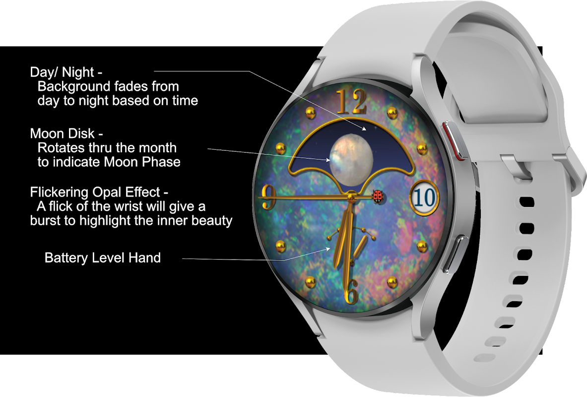 وجه تناظري جميل يعطي توهجًا داخليًا عند التواء معصمك. يتلألأ القمر اللامع عبر خلفية النهار / الليل طوال الشهر ، مما يمنحك تمثيلًا مرئيًا لمرحلة القمر الحالية.