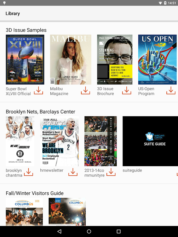 "Flipbook عارض" يسمح لك بتحميل وقراءة المنشورات الرقمية التي تم إنشاؤها باستخدام برنامج 3D العدد (V6 أو أعلى) على جهاز الروبوت الخاص بك.