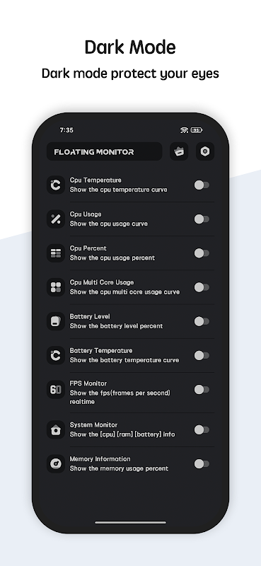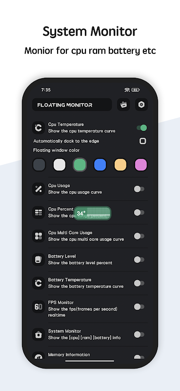 تُظهر الشاشة العائمة درجة حرارة وحدة المعالجة المركزية ومستوى البطارية واستخدام ذاكرة الوصول العشوائي في النافذة العائمة. عندما تفتح النافذة العائمة ، فإنك تراقب حالة وحدة المعالجة المركزية وذاكرة الوصول العشوائي والبطارية ، وهي مفيدة جدًا عند لعب لعبة ملء الشاشة.