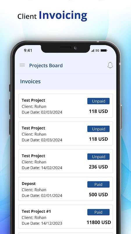 فواتير العميل: يمكنك مشاركة فواتير المشروع بسهولة مع العملاء الذين يمكنهم الدفع عبر الإنترنت أو دون الاتصال بالإنترنت. يمكنك أيضًا تحديث حالة الفاتورة وفقًا لذلك.