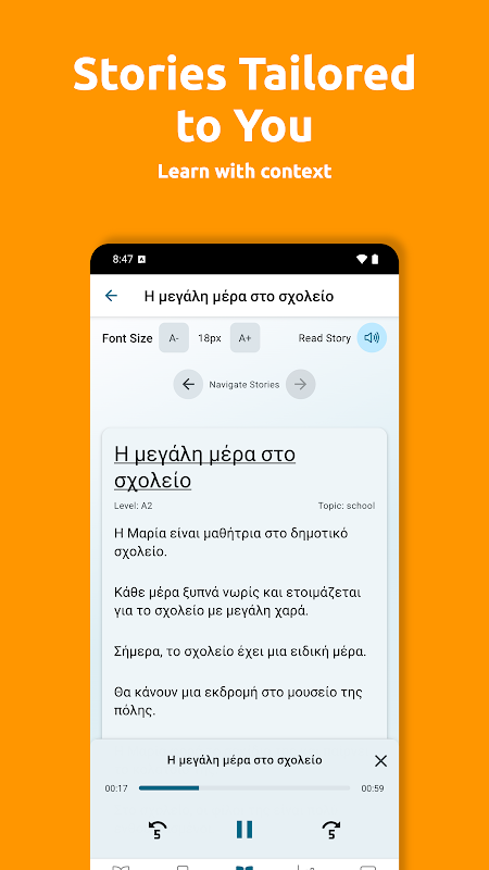 اقرأ قصصًا ممتعة وأصلية مُصممة خصيصًا لاهتماماتك ومستوى الإطار الأوروبي المرجعي العام (CEFR) (A1-C1). اختر لغتك، وموضوعك، وابدأ القراءة. يُساعدك التعلم القائم على السياق على تذكر الكلمات الجديدة بشكل أسرع واستخدامها في الحياة الواقعية.