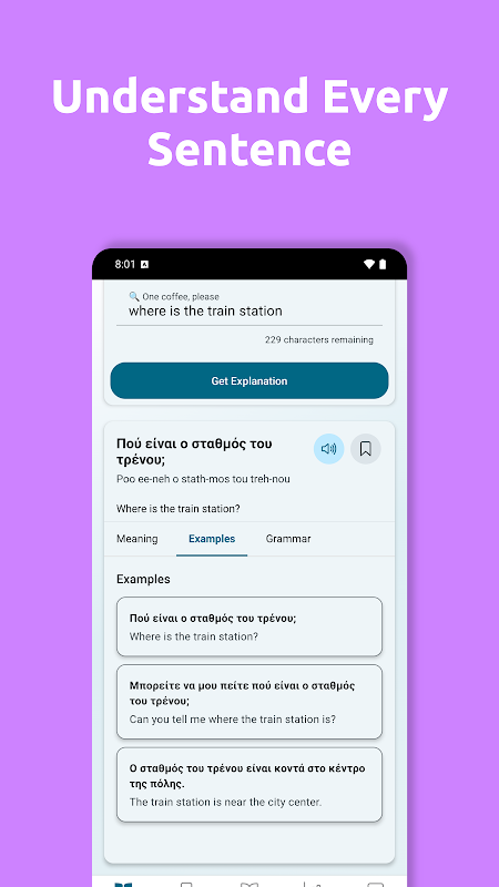 احصل على ترجمات فورية مُدعمة بالذكاء الاصطناعي، وتحليلات نحوية، ومساعدة في النطق، وأمثلة واقعية لأي كلمة أو جملة. تجاوز الترجمات الأساسية لفهم آلية عمل اللغة بشكل حقيقي.