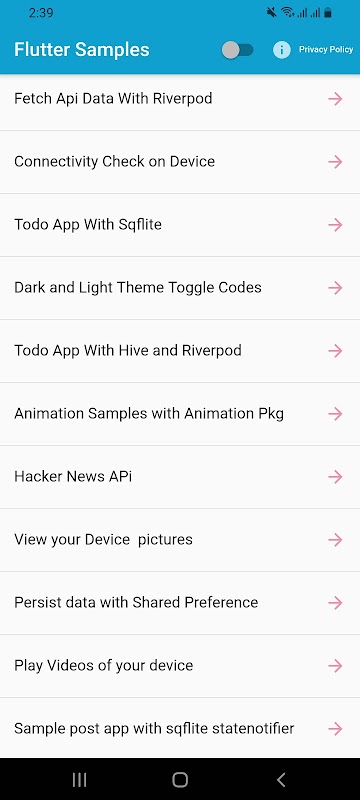 يتضمن هذا التطبيق دروس ورموز Flutter.