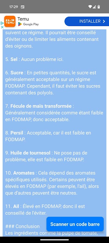 بالإضافة إلى إرشادك يوميًا، سيعلمك التطبيق كيفية تحليل المكونات بنفسك، مما يمنحك المفاتيح لإدارة الأعراض بشكل أفضل والحصول على راحة أفضل في الجهاز الهضمي.
