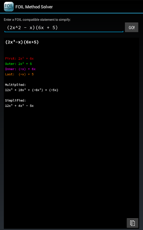 The FOIL method is a special case of a more general method for multiplying algebraic expressions using the distributive law. This app will only work in this special case.