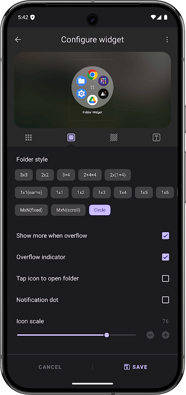 تُسهّل ميزة "المجلدات الكبيرة" التنقل في الشاشة الرئيسية لمشغل هاتفك، وذلك بتنظيم التطبيقات في مجلد كبير واحد أو أيقونة كبيرة، والوصول إلى التطبيق المطلوب بسرعة دون الحاجة لفتحه. يمكنك الوصول إلى المجلد الكبير بلمسة زر في الزاوية اليمنى السفلية منه.