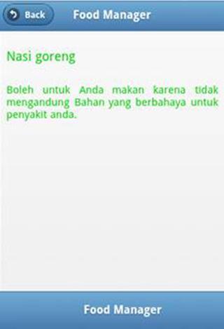 Kemudian, jika user tidak boleh memakan makanan yang berbahaya, maka aplikasi akan memberikan saran makanan apa yang sebaiknya dikonsumsi oleh user agar tidak membahayakan pada kesehatannya.