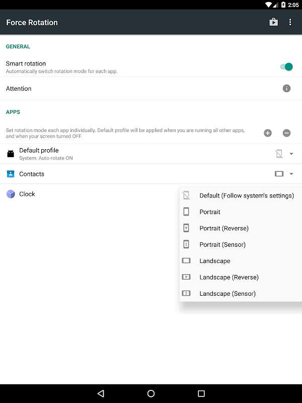 إضافة ميزة "Force Rotation" للتطبيقات الأخرى. يتخطى إعدادات النظام ، ويسمح لك بتغيير إعداد التدوير لتطبيقاتك.