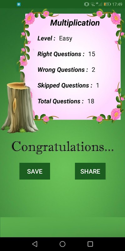 يمكنك إظهار نتيجتك (نوع العملية والمستوى والأسئلة الصحيحة والأسئلة الخاطئة والأسئلة التي تم تخطيها وإجمالي الأسئلة) وحفظها أو مشاركتها مع الأصدقاء