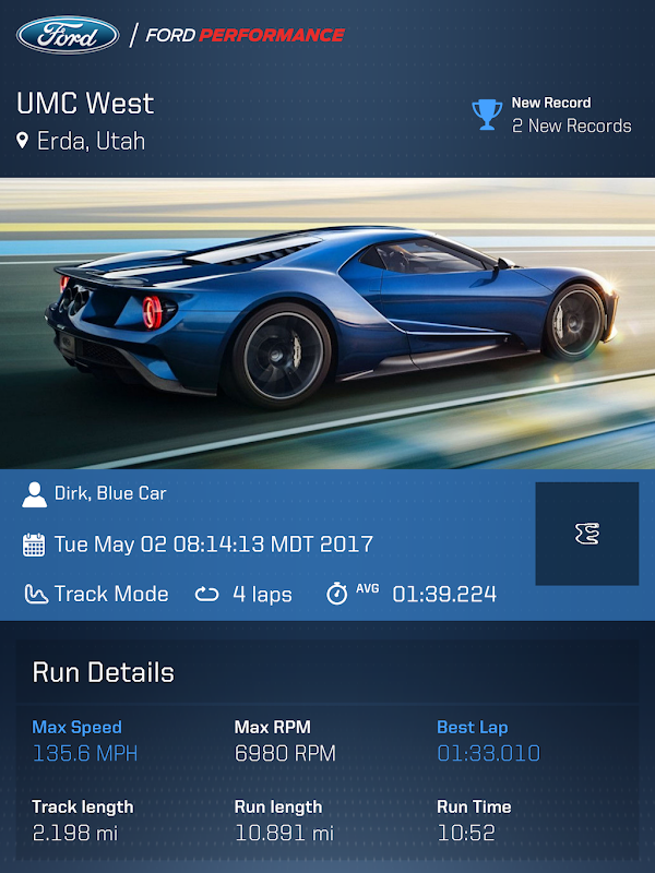 فورد الأداء App® كل جديد يجلب تسجيل المسار القائم على البيانات والتحليلات المتقدمة وتسجيل الفيديو للعملاء متحمس. التطبيق يتيح للمستخدمين بث إنجازاتهم على وسائل الاعلام الاجتماعية على الفور تقريبا بعد الانتهاء من جولة في المسار.