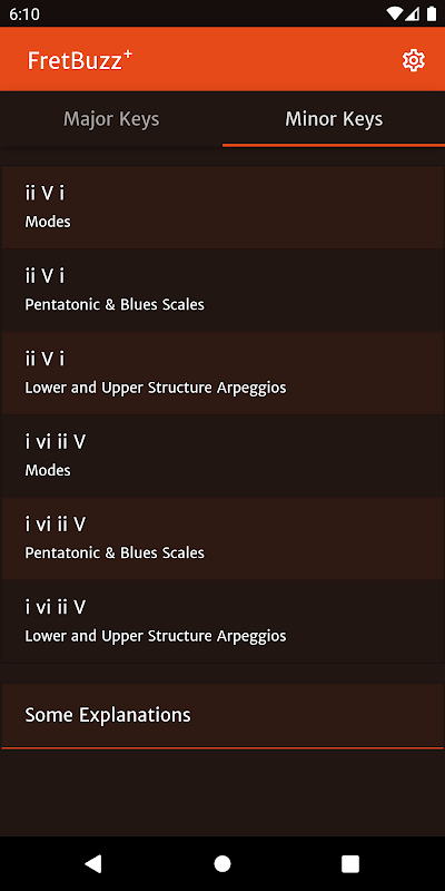 يمكنك اختيار التقدم واختيار ممارسة أي من الأوضاع ، أو المقاييس الخماسية أو تتابعات الهيكل العلوي / السفلي. يقوم التطبيق بعد ذلك بإنشاء رسوم بيانية للوحة الفريتس لتتمرن عليها.