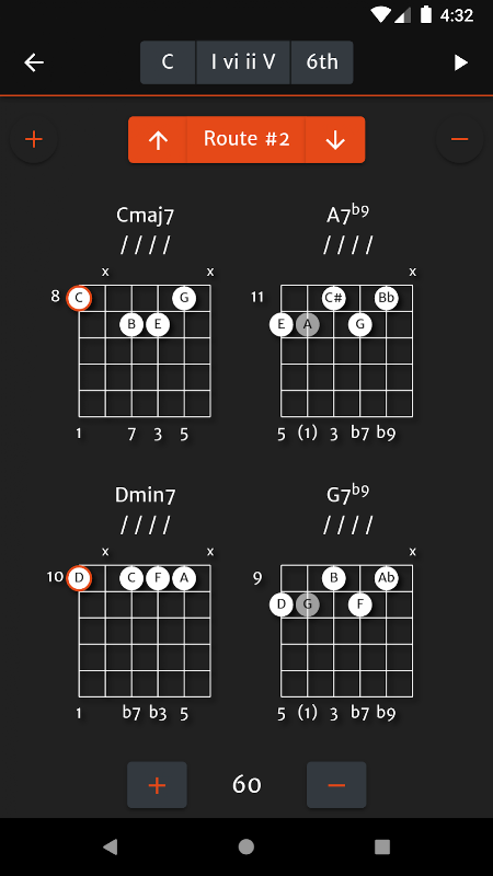 يمكن للتطبيق تشغيل التقدم والاختلاف الذي تختاره مع بندول الإيقاع. يمكنك ضبط سرعة بندول الإيقاع والمتابعة مع تمييز وتر العزف / الرسم التخطيطي.