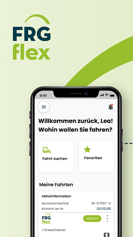 FRGflex هو عرض التنقل من منطقة Freyung-Grafenau. يمكن حجز الخدمة على مدار الساعة تقريبًا، طوال أيام الأسبوع. للقيام بذلك، استخدم تطبيق FRGflex. وقت الحجز المسبق عادة ما يكون 60 دقيقة. يمكن نقلك من محطات التوقف أو من نقطة الالتقاء إلى محطات التوقف أو وجهتك المباشرة. يمكن للمسافرين الإضافيين الصعود على طول الطريق. مقابل هذه الخدمة، يتعين عليك دفع تعرفة النقل العام بالإضافة إلى رسم إضافي قدره 3.00 يورو FRGflex. إذا كنت ترغب في القيادة من باب إلى باب، فسيكلفك ذلك 5.00 يورو إضافية.