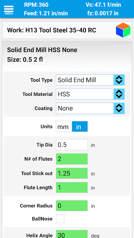 قم بحساب السرعات والأعلاف ببساطة عن طريق اختيار عملك ونوع الأداة ومواد الأداة.