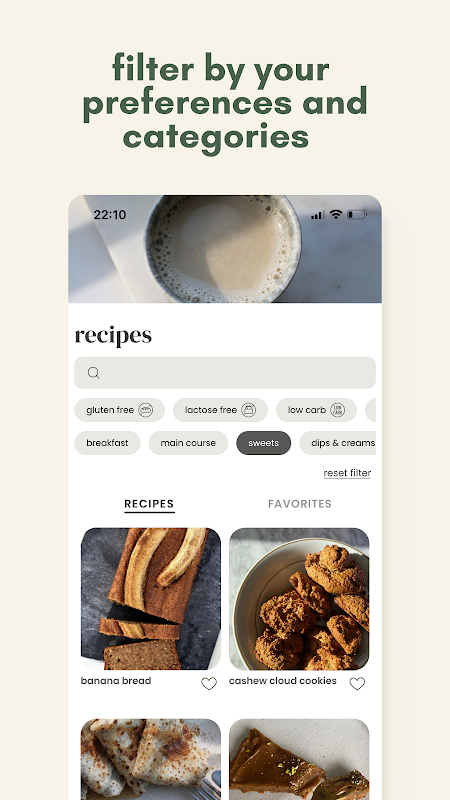 - سهولة البحث باستخدام وظيفة التصفية (نباتي، نباتي، خالي من الغلوتين، خالي من المكسرات، منخفض الكربوهيدرات، خالي من الصويا، خالي من اللاكتوز، وخالي من الخبز)