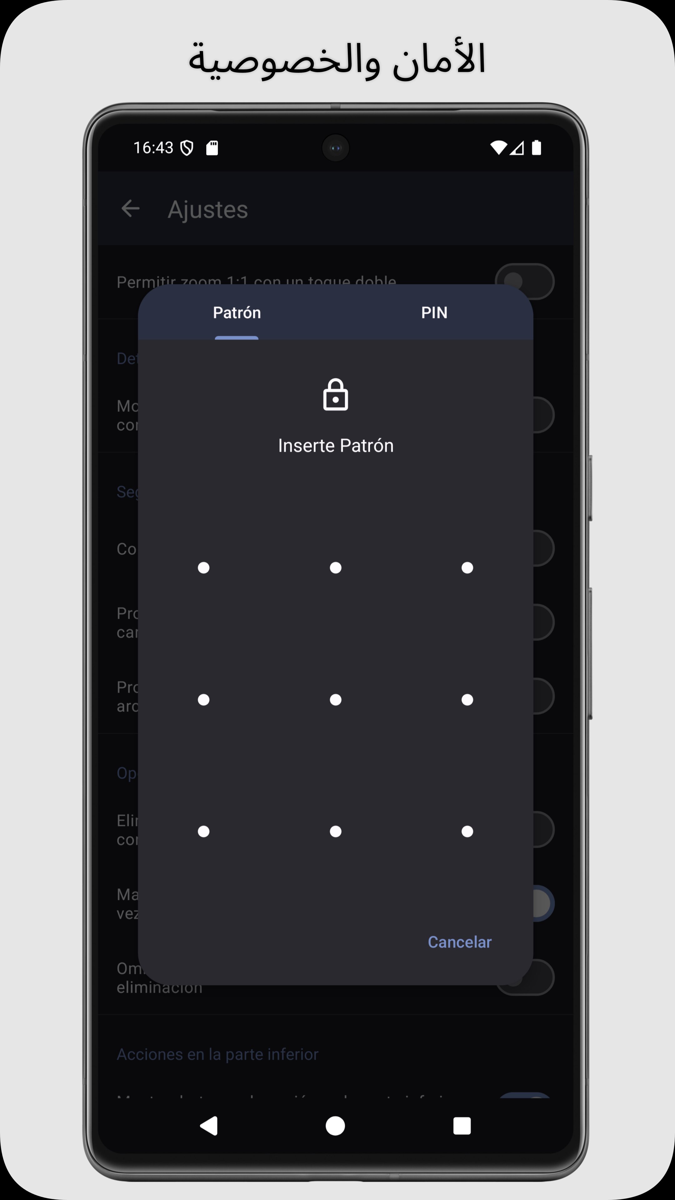 احمِ الوصول باستخدام رمز PIN، نمط، أو بصمة الإصبع.