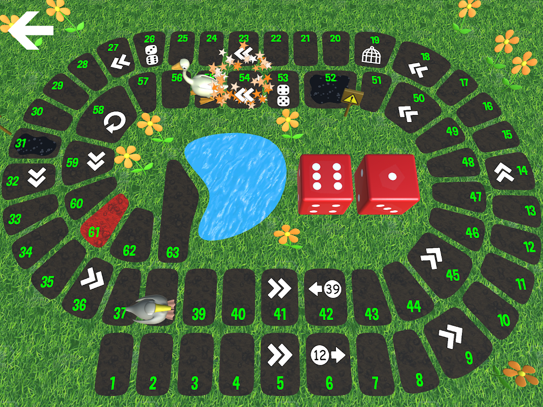 هذا هو نسخة حديثة من اللعبة التقليدية. للفوز في المباراة، تحتاج إلى الحصول على أوزة الخاص بك على الساحة الأخيرة. كل لاعب يأخذ المنعطفات للفة النرد. ثم ينقلون أوزةهم بعدد المواقف التي تدحرجوا فيها. إذا كانت لفة ما مجموعه 9 على منعطفهم الأول، ثم أنها سوف تقفز إلى موقف خاص. إذا كانت الأرض على أوزة اللاعب الآخر، ثم مبادلة الأماكن. إذا كانت الأرض على موقف مع السهام، ثم تتحرك نفس المبلغ مرة أخرى. إذا كانت عالقة في المواقف 31 و 52، ثم لديهم لتفويت 3 المنعطفات، إلا إذا تم تمريرها من قبل لاعب آخر. للفوز في المباراة، يجب على كل لاعب الهبوط بالضبط على الساحة الأخيرة. إذا كان عدد من التحركات هو أكثر من آخر مربع، ثم أوزة سوف تتحرك إلى الوراء لبقية.