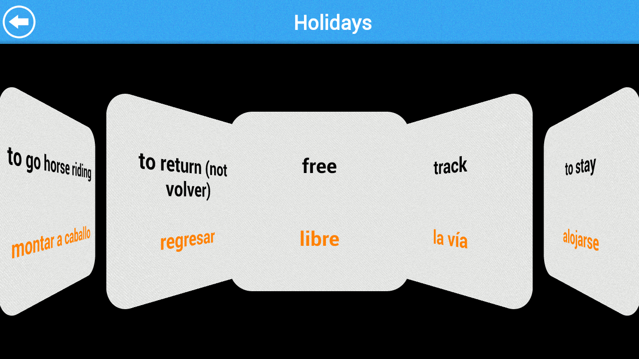 This innovative app has beautiful flash cards with coverflow view which can be viewed either by Spanish to English or English to Spanish.