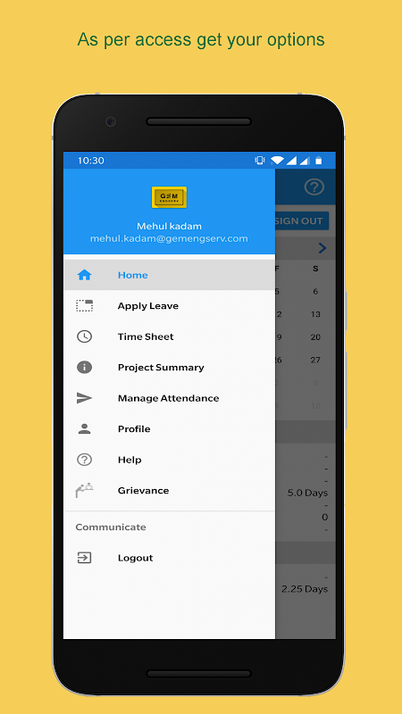 • يمكن لموظفي GEM Engserv تسجيل الوقت الذي يقضونه إما في المشاريع أو الأنشطة الوظيفية الأخرى. الموظفين أيضا التقدم بطلب للحصول على إجازة من خلال هذا التطبيق.