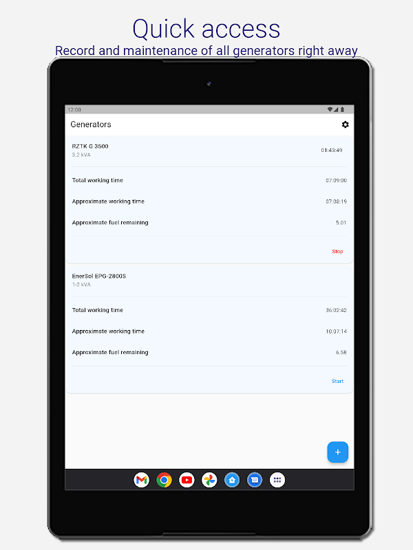 هل لديك مولد كهرباء؟ تعبت من تسجيل وقت العمل؟ لا تتذكر آخر وقت تغيير الزيت؟ ثم سيقوم هذا التطبيق بتبسيط خدمته لك. فقط تخيل جهاز كمبيوتر محمول به إمكانية تحديد بداية العمل أو نهايته بنقرة واحدة.