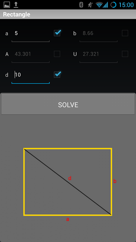 This requires the app any known values ​​are given,e.g. the side lengths of a triangle. The app will now calculate the remnant values ​​such as area and perimeter as well as the angles of the triangle.