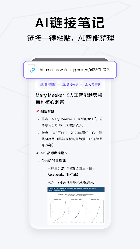 -تسجيل رابط الذكاء الاصطناعي: أضف رابطًا، وسيقوم الذكاء الاصطناعي تلقائيًا بقراءة محتوى صفحة الويب وإنشاء ملاحظات موجزة وواضحة للرجوع إليها في المستقبل.