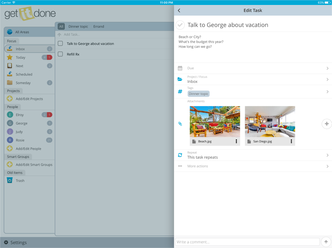 تحكم في حياتك من خلال Get It Done Tasks، منظم المهام سهل الاستخدام والخالي من الإعلانات المستوحى من كتاب David Allen الأكثر مبيعًا، Getting Things Done (GTD). يساعدك هذا التطبيق، المصمم لعشاق الإنتاجية والمستخدمين العاديين على حد سواء، على التركيز على ما يهم اليوم مع الحفاظ على كل شيء آخر منظمًا بدقة.