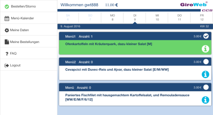 يوفر تطبيق GiroWeb تطبيقًا مشابهًا لبرامج portal على الويب أو طرفيات الطلب ، وهي طريقة متحركة للتعامل مع الطلبات المسبقة من القائمة ، ويمكنك طلب طعامك بسهولة باستخدام هاتفك الذكي أو جهازك اللوحي في أي وقت وفي أي مكان.