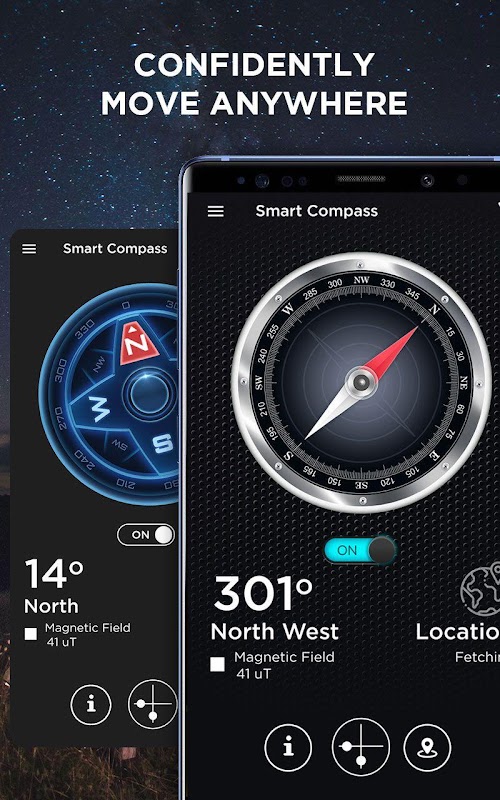 To use Super Compass Global - Accurate Compass for Android, keep your device flat and use Compass Direction app like a real compass. Your phone must have MAGNETIC SENSOR inside to read the earth's magnetic field. If your device does not have a magnetic sensor, Compass 360 Degrees or any other compass application will not work.