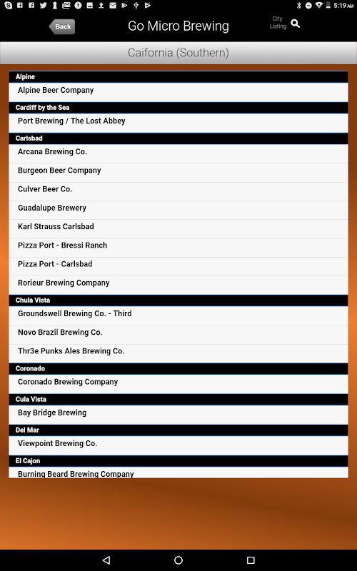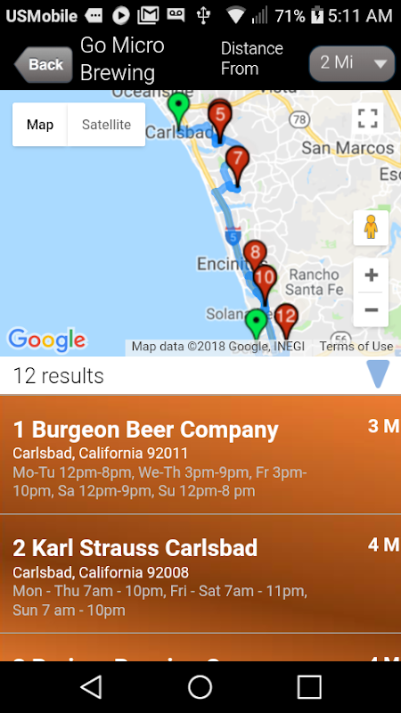 Provides a list of participating Micro Breweries within a specified distance (5 mi, 10 mi) of your current location. The results are provided either alphabetically or by distance.