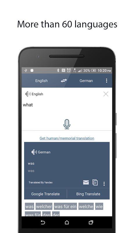 Provides the following options: tap to translate, copy translate ,widget translator , popup translation, vocabulary , pronunciation, real-life examples, phrasebook , SMS Translator and more.