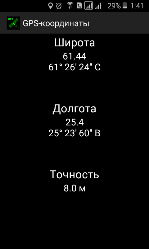 GPS-координаты - - приложение для определения координат вашего расположения. Координаты отображаются в системе широты и долготы. Параметр Точность отображает точность определения в метрах.