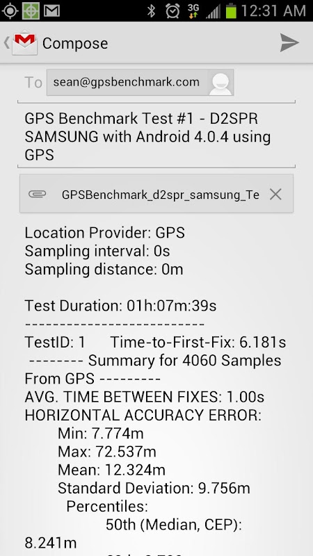 The ground truth location of the mobile device is set by tapping on a satellite map (or manually entering lat/long/alt). The app then measures the error of positions calculated by the phone, generates various statistics on these errors (e.g., min/max/avg horizontal and vertical error, percentiles, etc.) and attaches the results (printout, CSV and KML files) to an email. GPS Benchmark supports benchmarking for GPS and network location providers such as cellular or Wi-Fi network positioning.