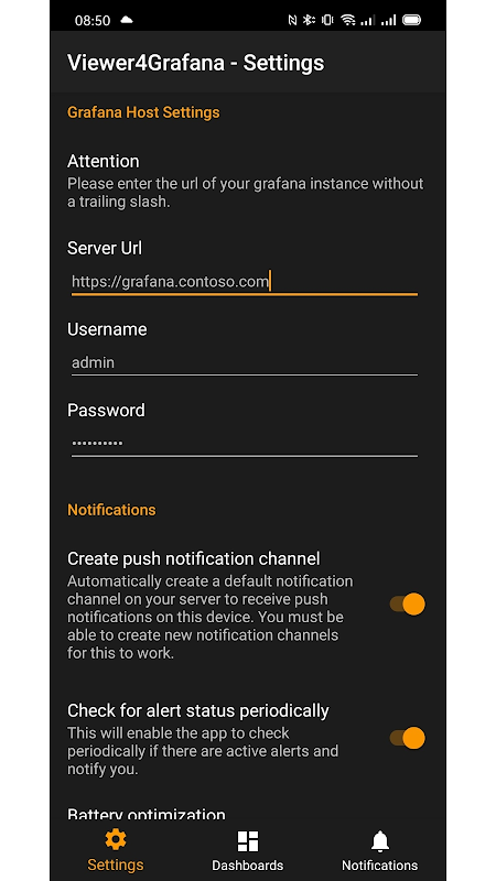 Connect to your Grafana server and view your dashboards and receive notifications for alerts!