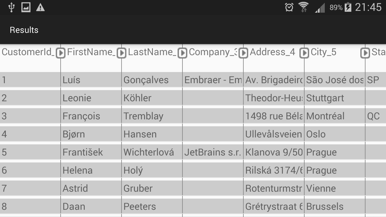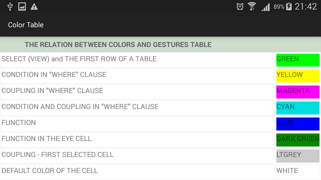 Metaphors, Color and other functionality like zoom are used for the best comprehension of the database schema and the query development. The multi-touch gestures which performed on the device display, translated to equivalent SQL queries and executed in the SQLite database. The by default selected database for this initial version of the application is the Chinook database.