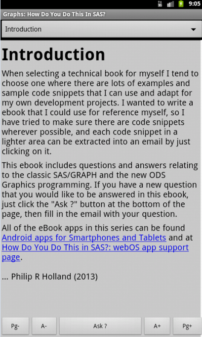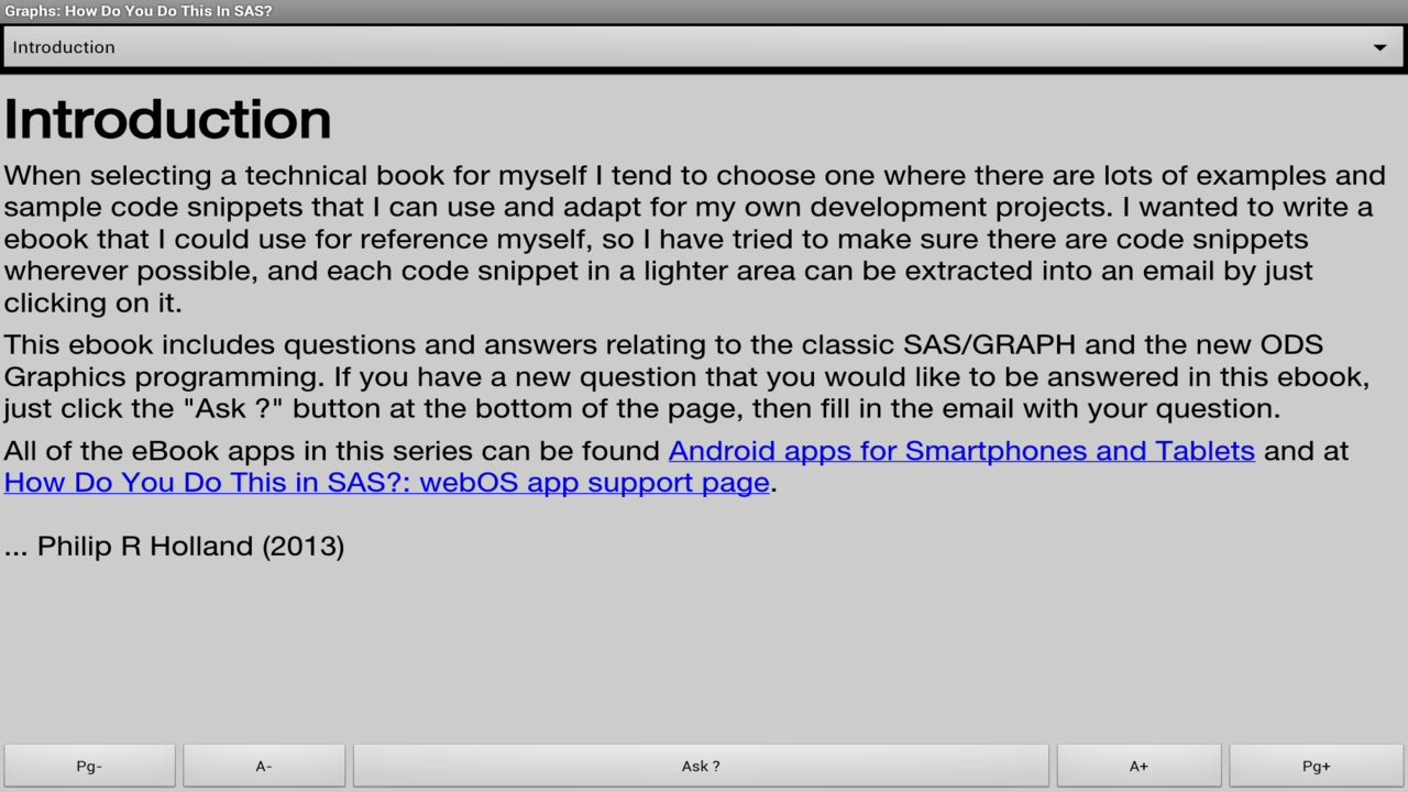 This app, "Graphs: How Do You Do This In SAS?", is one of a series of eBooks about SAS software programming focusing on frequently asked questions and answers about classic SAS/GRAPH and the new ODS Graphics, illustrated by code samples which can be sent by email directly from the app. The series of ebooks has been designed to encourage users to contribute questions some of which will be included in future versions of the app.