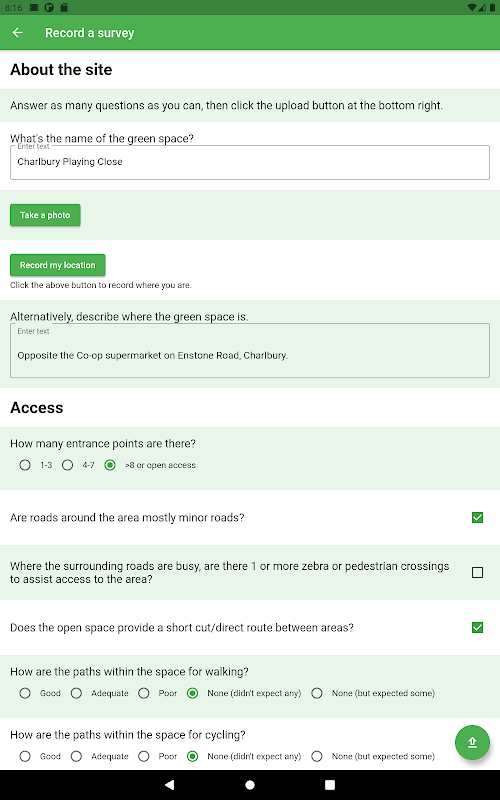 Greenspace Hack هو مشروع من قبل جامعة أكسفورد ومجلس مقاطعة أوكسفوردشاير لتسجيل تجربتك في المساحات الخضراء. باستخدام استطلاع راسخ مصمم خصيصًا للمساحات الخضراء ، يمكنك إخبارنا بسرعة وسهولة عن المساحات الخضراء. سنقوم بعد ذلك بإضافته إلى الخريطة داخل التطبيق لمساعدة الآخرين على اكتشافه.