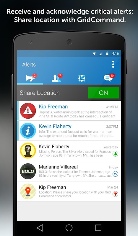 Receive critical alerts instantly from your agency coordinator in GridCommand, a web application that increases situational awareness, tracks teams, and advances interoperable communications. Acknowledge received alerts with "Accept" or "Reject" status, or choose "Reply" to alert sender with additional input. Push notifications will let you know when a new alert is received. Read receipts let your coordinator know whether you've seen the alert. A backup email will let you know about an alert when you're away from your phone.