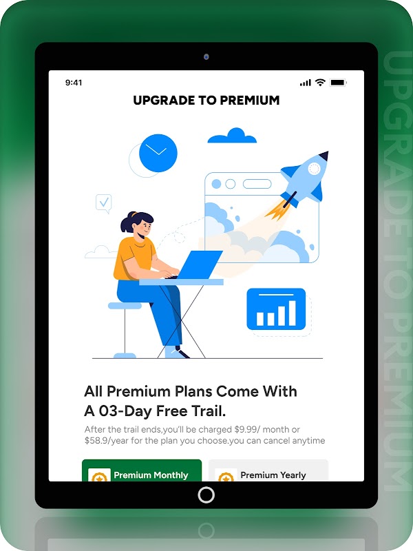 تعرض شاشة الترقية المتميزة حزمتين: شهرية وسنوية. بعد تحديد الحزمة، ينقر المستخدمون على "بدء النسخة التجريبية" للوصول إلى شاشة الاشتراك في الدفع، حيث يتم عرض تفاصيل الحزمة.