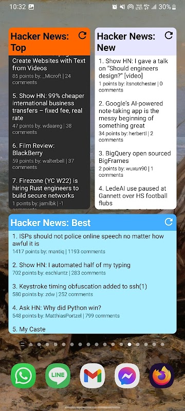 عناصر واجهة مستخدم كاملة لجميع أجزاء أخبار الهاكر حتى تتمكن من رؤية الأخبار على شاشاتك الرئيسية. يحتوي التطبيق على سمات ألوان متعددة مدعومة أيضًا في الأدوات.