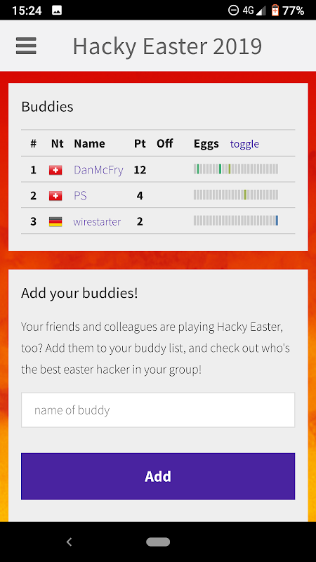 The app verifies your Hacking-Lab account, and registers you on the Hacky Easter server. Registration is needed in order to access the challenges, and to submit solutions.