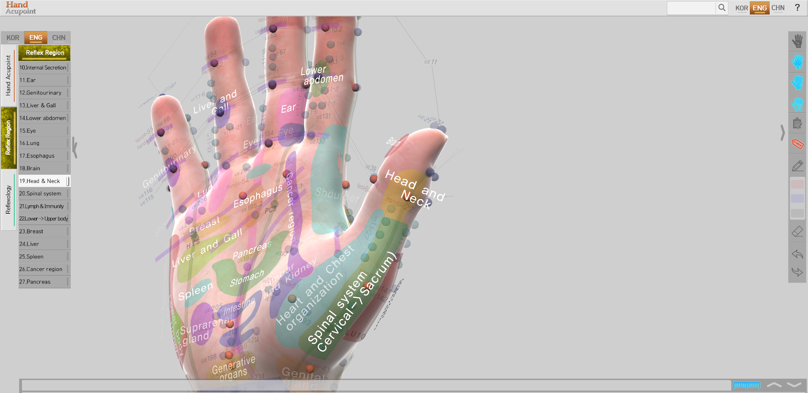 - المنطقة المنعكسة التي تم استخدامها كأساس للتشخيص في علاج الوخز بالإبر التقليدي لليد تم ترتيبها أيضًا بشكل ثلاثي الأبعاد. يتم أيضًا ترتيب مخطط Reflexoloy المستخدم كأساس لأشكال التشخيص والعلاج الأخرى بشكل ثلاثي الأبعاد. يمكنك مقارنة المنطقة المنعكسة للشكل التقليدي مع مخطط Reflexoloy للنظريات الأخرى ثلاثية الأبعاد، ويمكنك أيضًا مقارنة نقاط الوخز اليدوية ثلاثية الأبعاد.