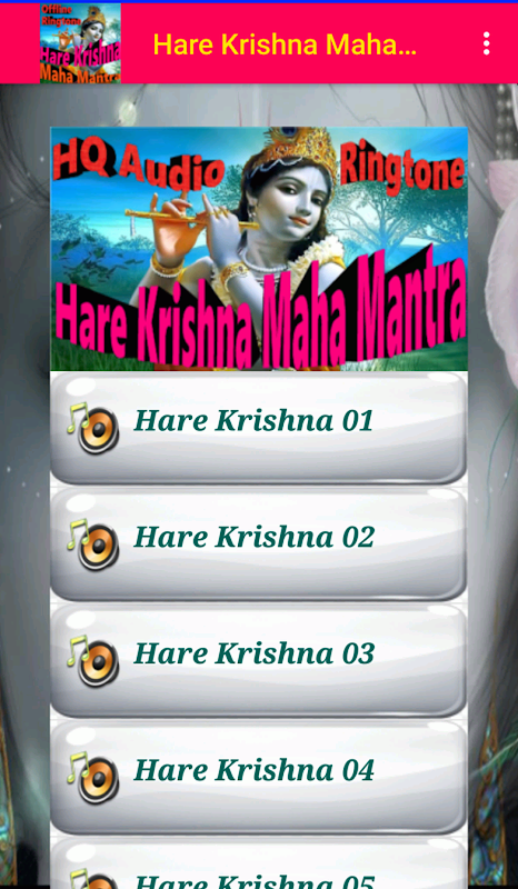 يقدم Hare Krishna Maha Mantra 12 أفضل مجموعة Dhun (أغاني) من أشهر الشعارات، Hare Krishna Maha Mantra. قم بتثبيت سحر Hare Krisna Hare Rama Dhun واستمتع به في أداة Android الخاصة بك. استمتع بأفضل أغاني Hare Krishna Maha Mantra بصوت عالي الجودة دون اتصال بالإنترنت مع نغمة رنين وتشغيل جميع الميزات.