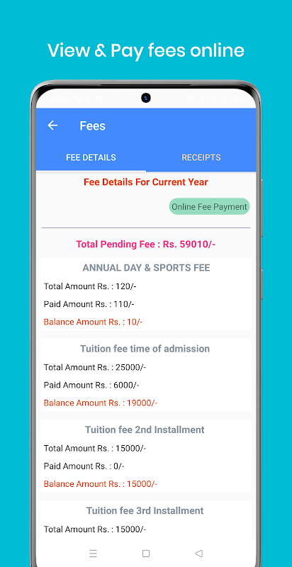 • تفاصيل الرسوم - عرض تفاصيل الرسوم كاملة (المدفوعة / الرصيد / الإيصالات)