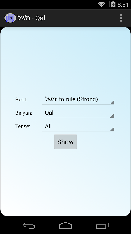 هذا التطبيق يظهر الإقتران من الأفعال العبرية في binyanim ويتوتر مختلفة، وذلك باستخدام جذور اختيارها كمثال.