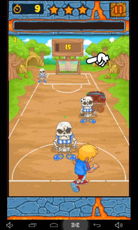 Move your footballer to the left and right, press and hold to increase shot strength (go to the maximum to knock-down enemies!). Score as many goals as you can, since they bring most points and you need to reach certain amount of points to pass the level.