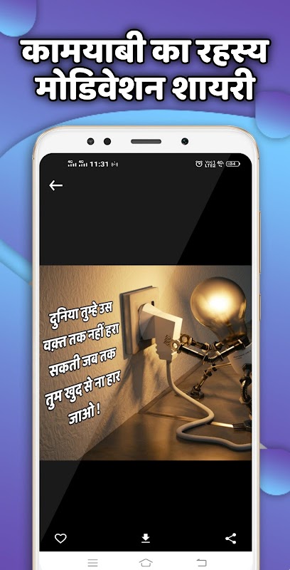 Easy interface one click to share on Whatsapp, Whatsapp status, facebook, instagram and other social media site. One click to save shayari images on you Smartphone. Try HePost app. It’s best app for hindi shayari.