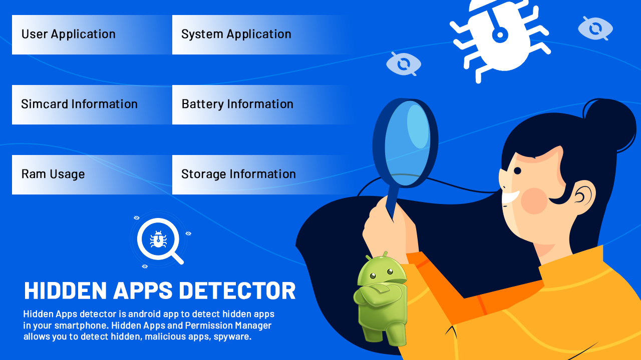 يقوم تطبيق الماسح الضوئي للتطبيقات المخفية بمسح جميع التطبيقات داخل هاتفك المحمول وتقسيمها إلى قسمين: الجزء الأول هو معلومات تطبيقات النظام والثاني هو معلومات تطبيق تثبيت المستخدم. في تطبيقات النظام، نعرض تثبيت التطبيق بواسطة نظام android وهو مخفي للمستخدم ولا يظهر للمستخدم لأن المستخدم لا يمكنه فعل أي شيء مع تلك التطبيقات.