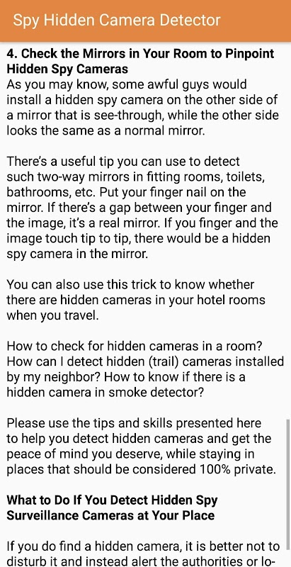 Select any option in hidden camera detector app and move your Android phone near suspected devices such spy camera and microphone. the reading show possibility of camera. Scan bedroom changing room bathroom for Top Hidden camera because there is more possibility of spy camera.